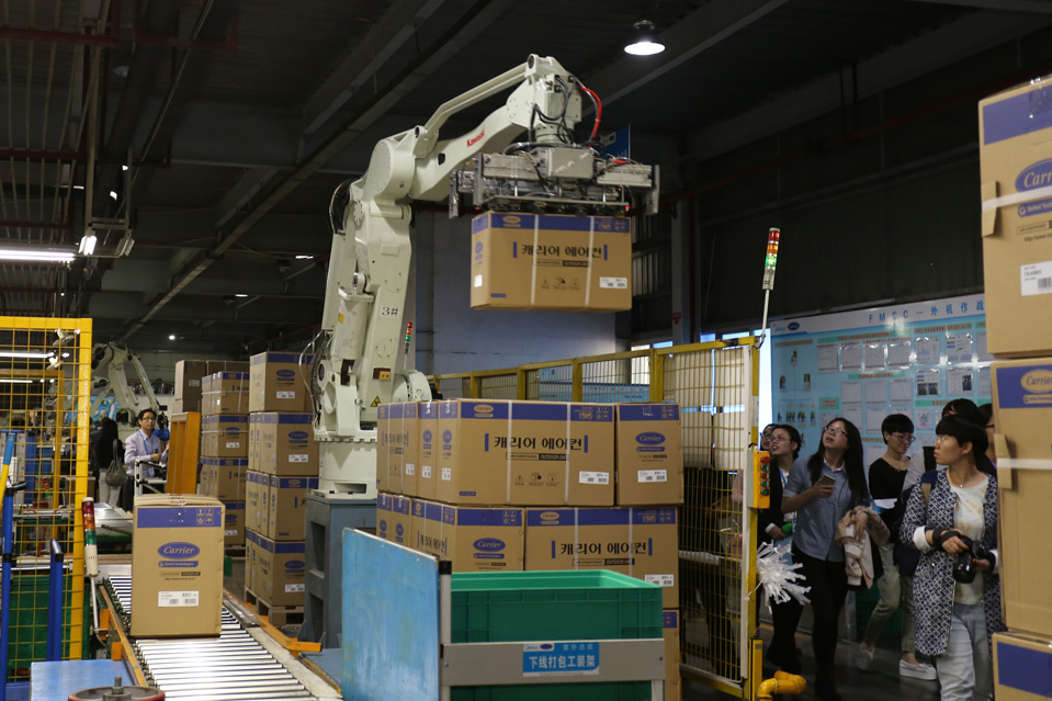 現(xiàn)在的空調(diào)生產(chǎn)線,出現(xiàn)的已不再是擁擠忙碌得跟陀螺似的產(chǎn)業(yè)工人。因為不少的“機器手”、“機器人”的出現(xiàn),勞動密集型的家電制造工廠被賦予了全新的“科技感”和“智能化”的色彩。在空調(diào)室內(nèi)、外機總裝線體的末端,裝箱、打包等繁重環(huán)節(jié),早已被機器人所取代。當成品從生產(chǎn)線上完成之后,也是通過機器手直接搬運到流轉(zhuǎn)板上。